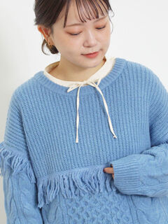 ふわふわなフリンジとケーブル柄の切替がポイントになったニット。