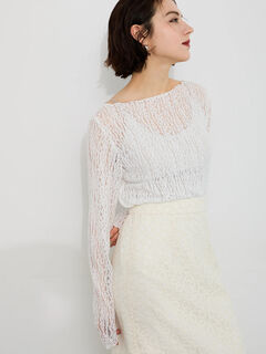 ポコポコとした程よい立体感のある繊細なストレッチレースで仕立てられた抜け感のあるボートネックプルオーバー。袖口と裾部分はメローフリルになっており、さりげない甘さをプラス。キャミソールやビスチェと合わせたレイヤードコーデなら、女性らしさも一層引き立つ着こなしに決まります。