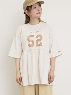 ギャザー切り替えのふんわりシルエットが可愛らしいチュニックTシャツ。