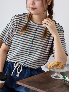 • 配色メローボーダーTシャツ(ピンク)|ehka sopo(エヘカソポ)通販 カラー:ピンク モデル身長:165cm 着用サイズ:F