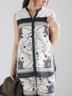 クラシックな雰囲気のスカーフプリントが施されたノースリーブブラウス。