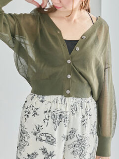 繊細な光沢感とさらっとした質感が特徴のLevita糸を使用した軽やかな風合いに仕上げたカーディガン。 大人が着やすい、程よいシアー感に仕上げました。顔周りをすっきり見せるシャープな印象のVネックもポイント。ゆったり感のあるスリーブシルエットで重ね着も楽にすることができ、肌触りも良く快適に着用していただけます。シンプルなデザインで着回し力も高く、ワードローブの定番アイテムとしても重宝しそうな1着です。