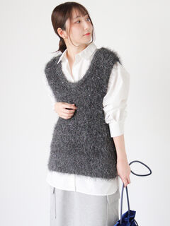 ラメの輝きとふわふわなシャギーニットが華やかなベスト。