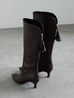 足元をすっきりと見せるロング丈のデザインが魅力的なブーツ。