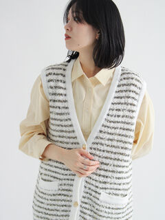 起毛感のあるツイード調の生地が上品な雰囲気を演出するニットジレ。
