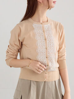 華やかなディテールが魅力のフロントレースクルーネックカーディガン。
