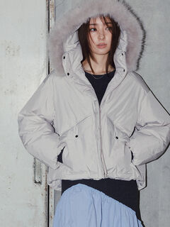 もこもこのファーが施されたフード付きのダウンジャケット。