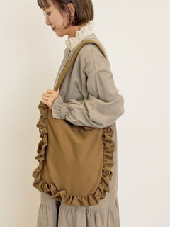 滑らかで温かみのある生地で仕立てられたフリルトートバッグ。