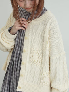 クロシェ風の編み柄を組み合わせたパッチワークデザインが目を引くニットカーディガン。