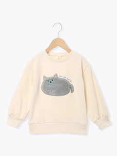 ふんわりやさしい風合いの素材に、もふもふとしたネコモチーフが目を引くトレーナー。