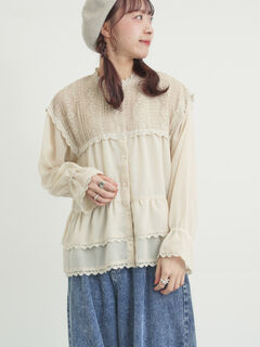 胸元の繊細なレース使いが可愛らしさを演出するブラウス。