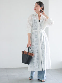付属の共布ベルトでシルエットの調整ができ、結び方次第で印象チェンジも可能。前を開けて羽織としても着用でき、着こなしの幅が広がる一着です。