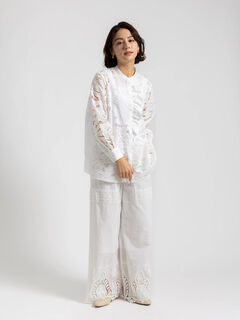 女性らしいスカラップ刺繍を贅沢にあしらった、上品な表情のコットンイージーパンツ。