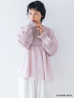 袖の一部を軽やかでシアー感のあるレースで切り替えた綿麻ブラウス。