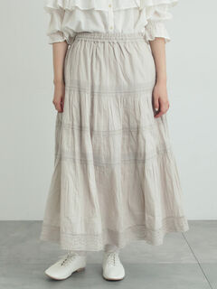 段々に切り替えたティアードデザインとレース使いがポイントのスカート。
