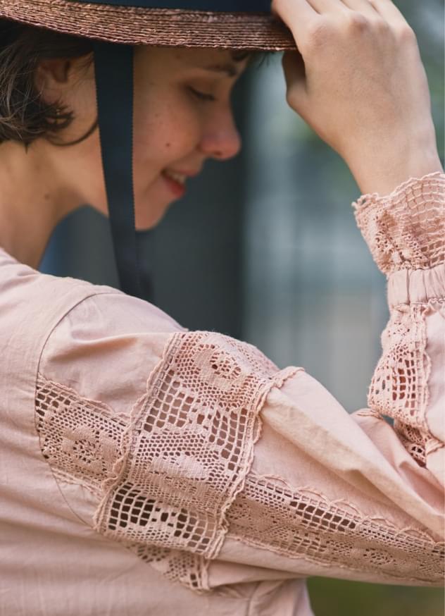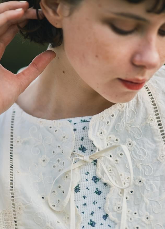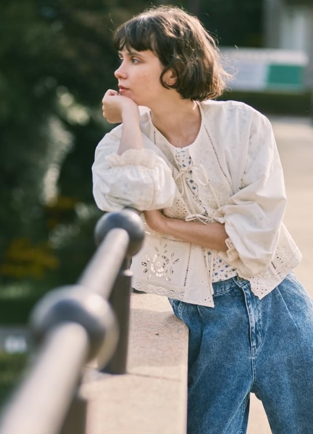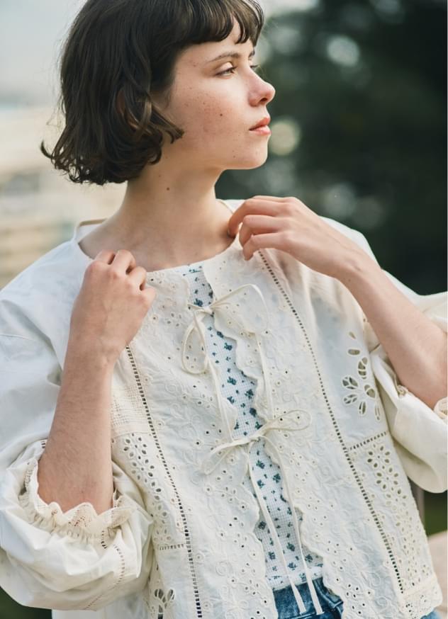 着るだけで春を感じられるレースのブラウスは合わせやすいショート丈。はしごレースに刺繍など様々な種類のレースを組み合わせ、フロントはリボンを結んで。小花柄のインナーを覗かせて思い切りガーリーに合わせるのが春の気分。ワイドなケミカルデニムで甘さをおさえてカジュアルに。
