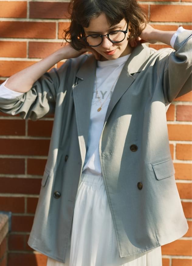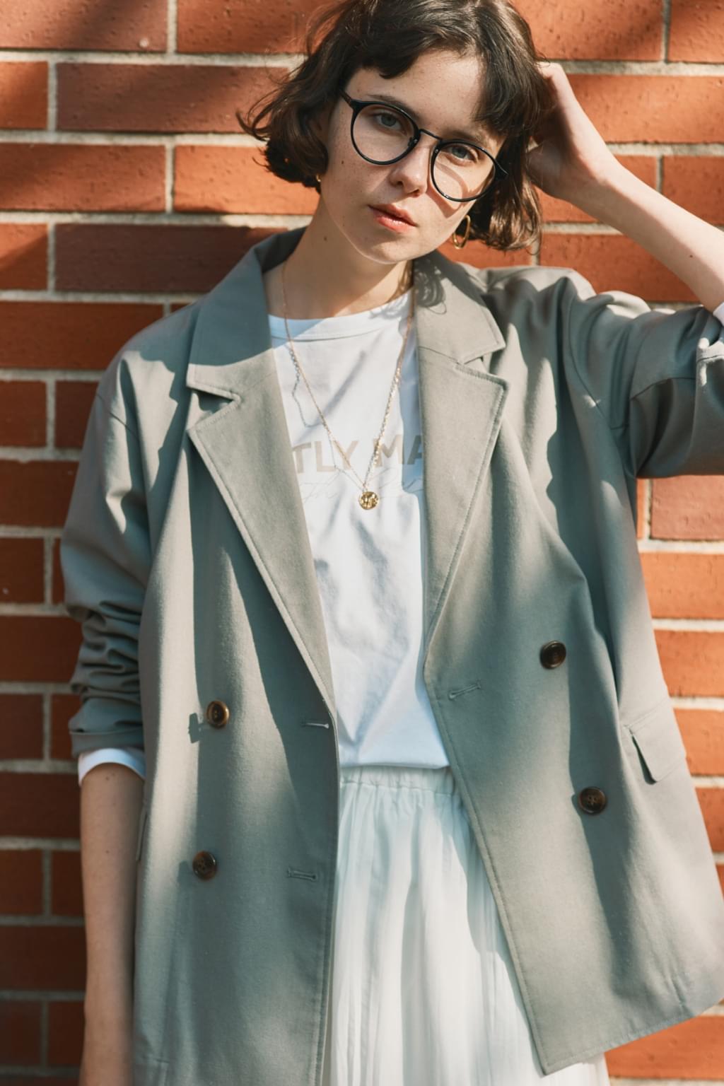 シャツ感覚で羽織れる軽い素材のジャケット。さらっと羽織るだけでコーディネートがまとまる優れもので、気温差のある季節に大活躍の一枚。ロゴプリントのカットソーと甘さのあるスカートを合わせて、シックになりすぎないフェミニンなスタイルに。腕をまくると抜け感が出てこなれた印象で着こなせる。