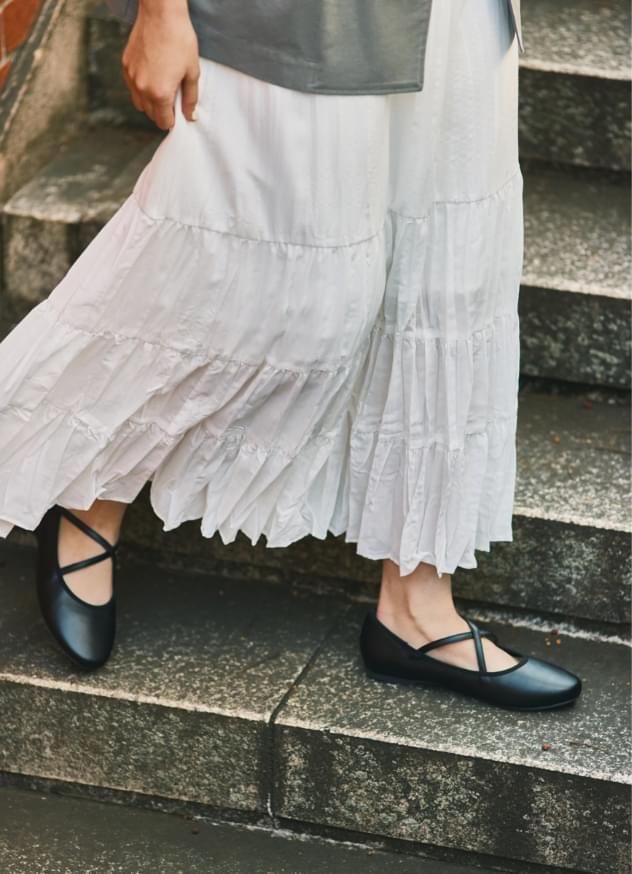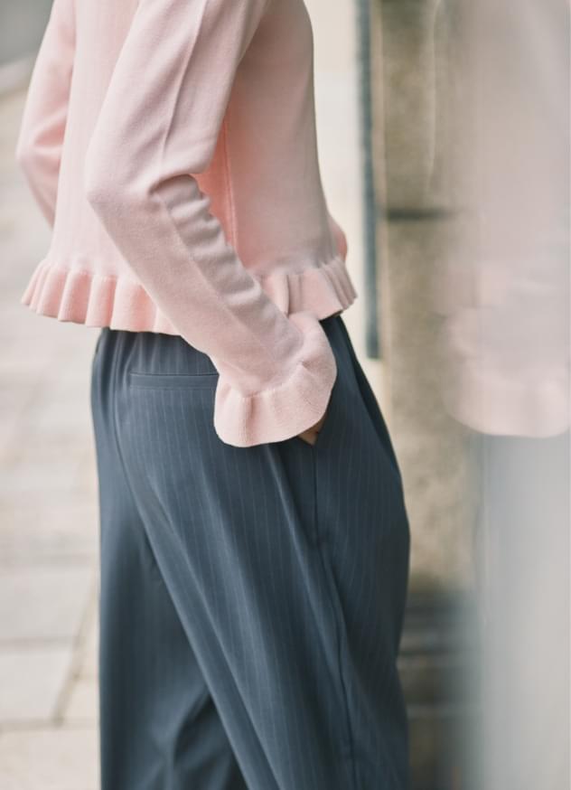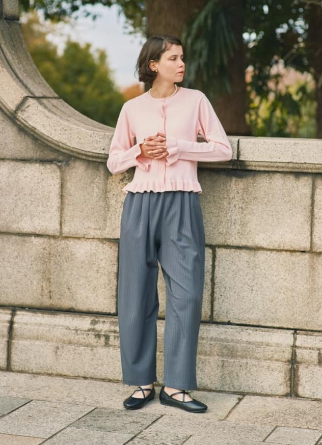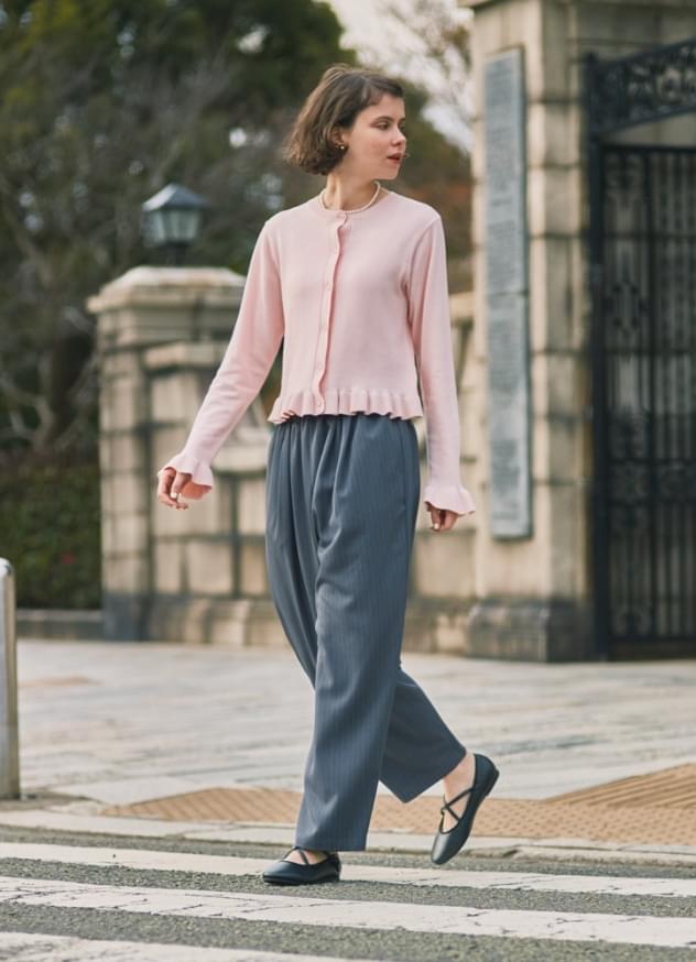 袖と裾がフリルになったハイゲージのカーディガンは前を閉じてシンプルに着こなすのが今の気分。楽な着心地で脚のシルエットをカバーしてくれるパンツはデイリースタイルの強い味方。フラットシューズを合わせて、ちょっぴりクラシックな甘辛MIXで大人ガーリーに。