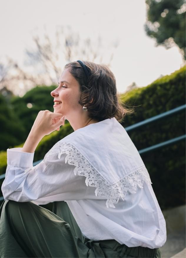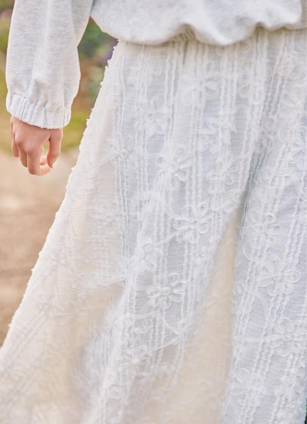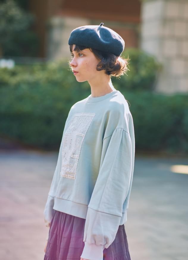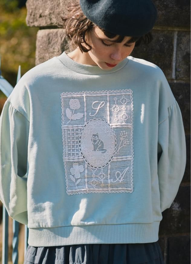 スウェットとスカートのシンプルなスタイルも、ディテールが可愛いアイテムを合わせれば華やかに。猫のレースモチーフがついたスウェットはドロップショルダーと袖のボリューム感が小さなポイント。軽やかな綿麻のスカートはタック&ギャザーで美しく広がるシルエットに注目。