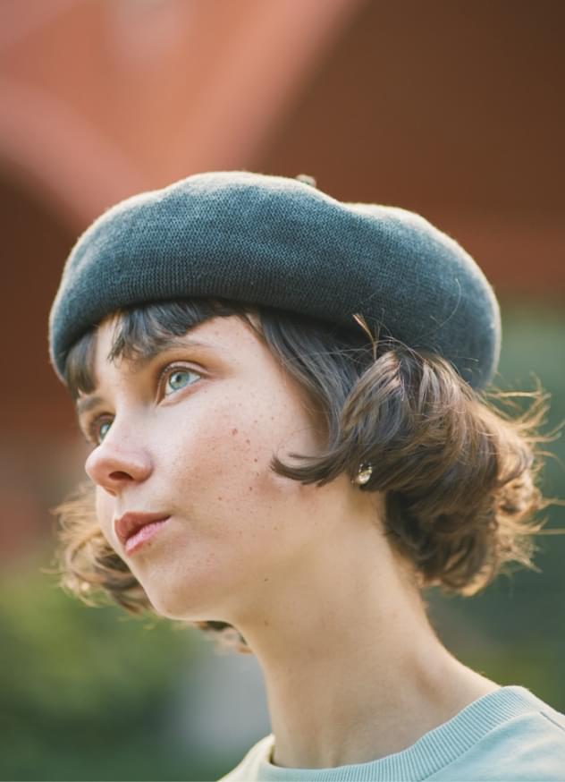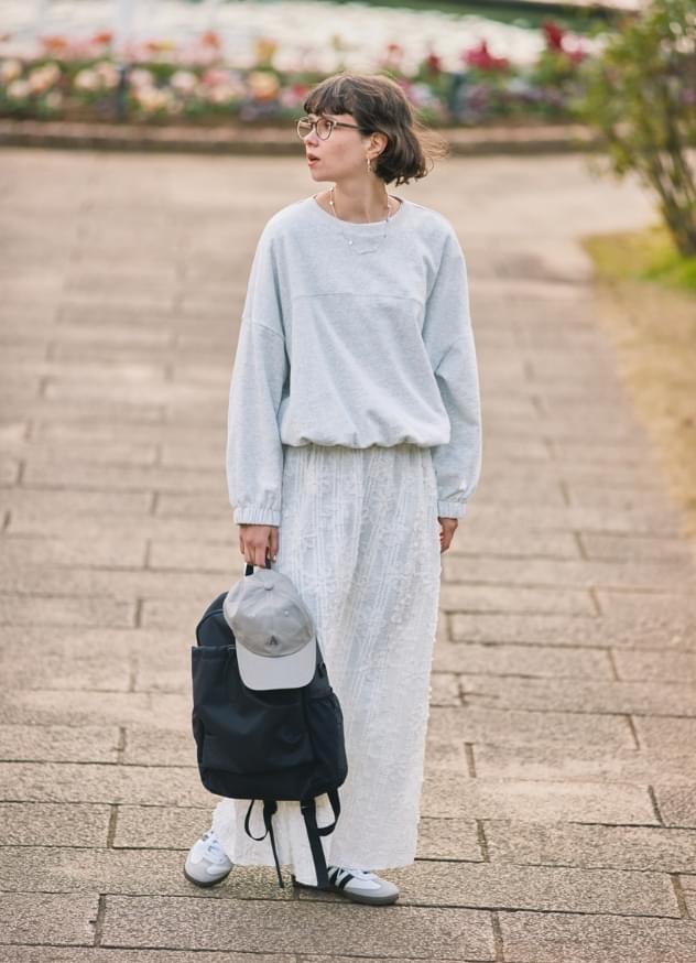 ラフになりすぎない秘密はシルエットや素材感。スウェットは切り替えのデザインと、袖口とすそのギャザーでアクセントのあるシルエット。立体的な模様で素材感が楽しいスカートを合わせて。スニーカーにキャップ&リュックでも、きれいめにまとめるにはきらり光るアクセをプラスするのがおすすめ。