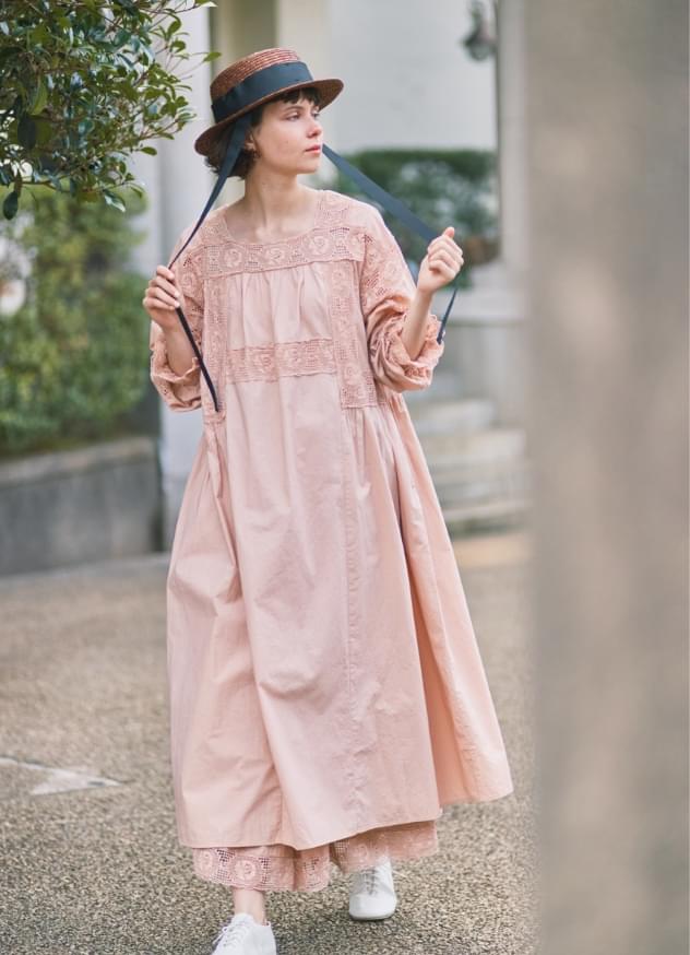 やっぱり、大好きなワンピースがなきゃ春は始まらない。ワンピースとパンツを合わせてワントーンにまとめれば、落ち着いたベージュピンクで甘すぎない雰囲気に。首元をすっきり見せてくれるスクエアネック、凝ったレースのデザイン。ときめきの詰まった春のスタイルを楽しんで。