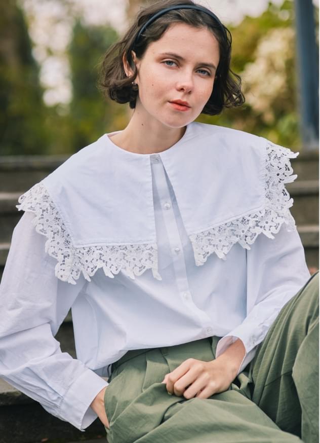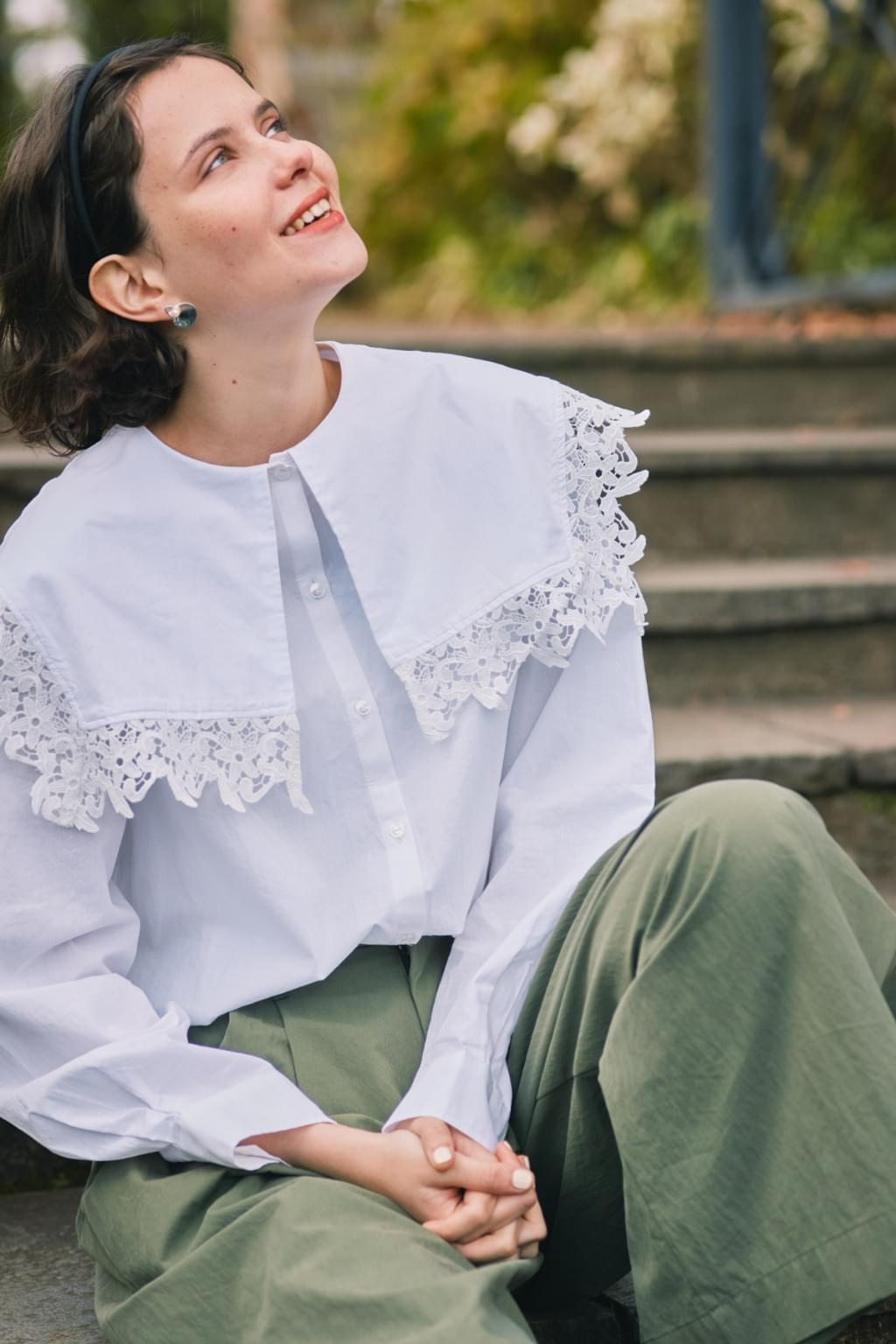 レースのついた大きなセーラーカラーが存在感大。フロントや袖周りはシンプルにスッキリとしたデザインの引き算で大人のセーラーに。合わせるのは、脚のラインが出ない張り感のある生地のワイドタックパンツ。ほんのりワーク風のカラーを選べばカジュアルなムードにまとまる。