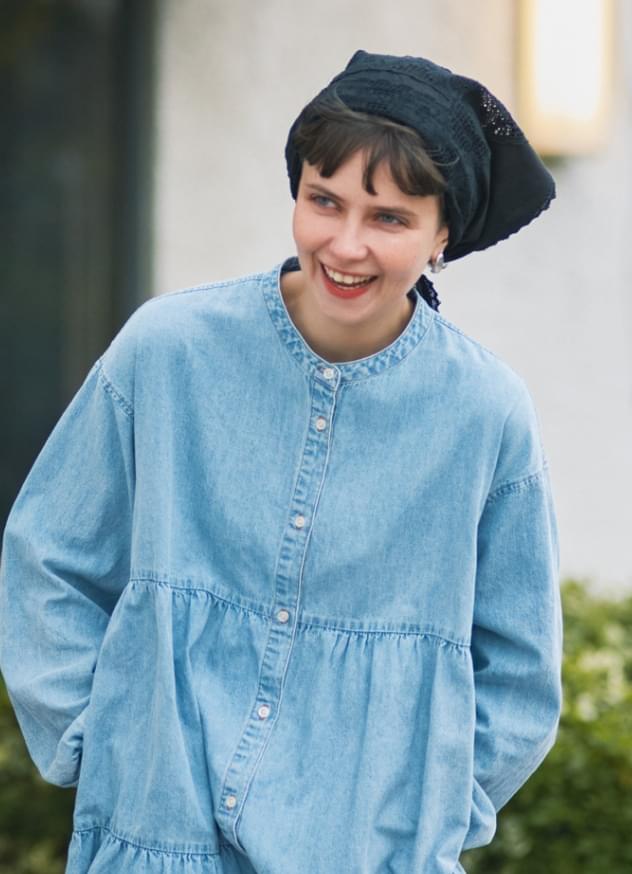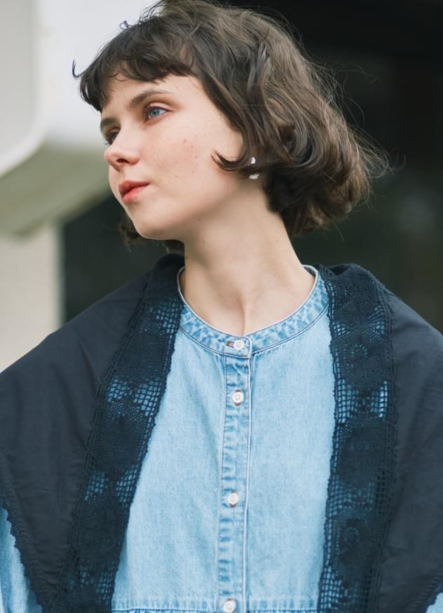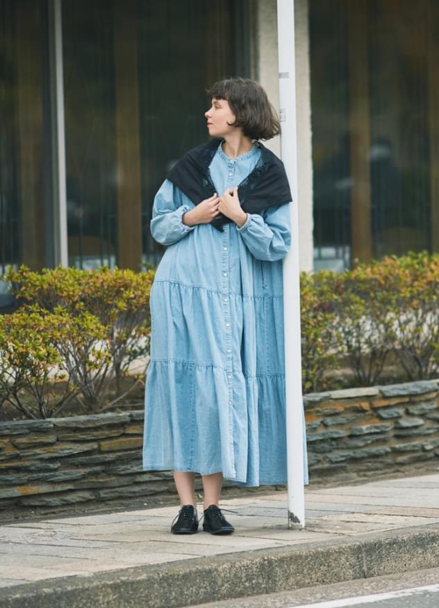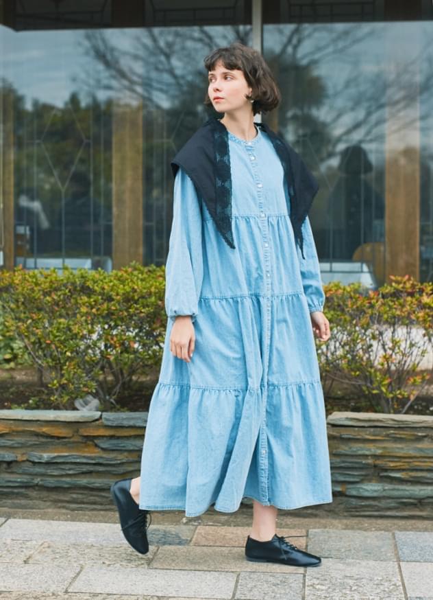軽いデニム素材のワンピースはティアードデザインでドラマチックな広がり。1枚着るだけでサマになるこだわりのシルエットに注目。襟元や袖はスッキリ、前開きなのでレイヤードも楽しめる。レース素材との相性も良いので、ポイントにストールをプラスするのも今年らしい。