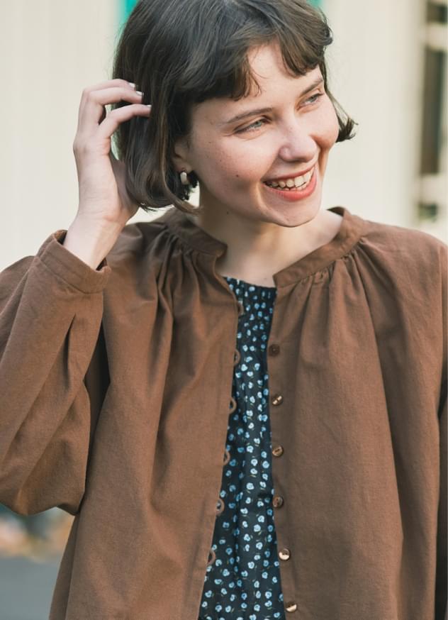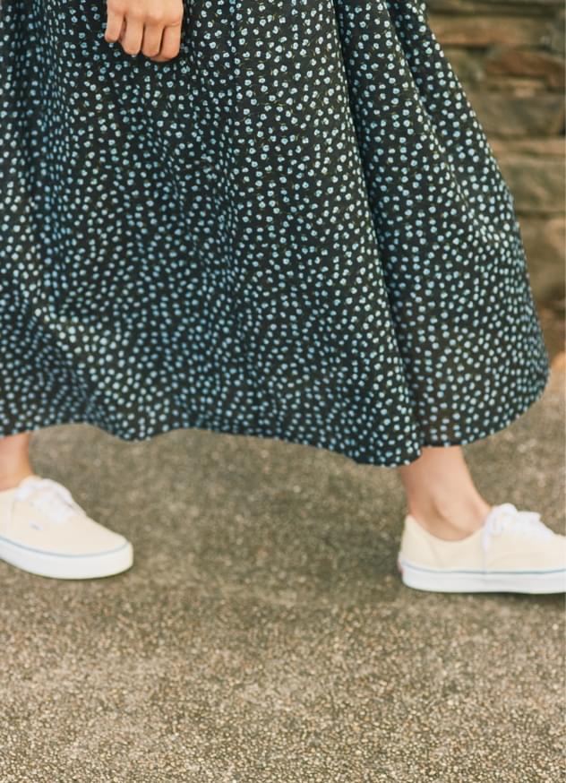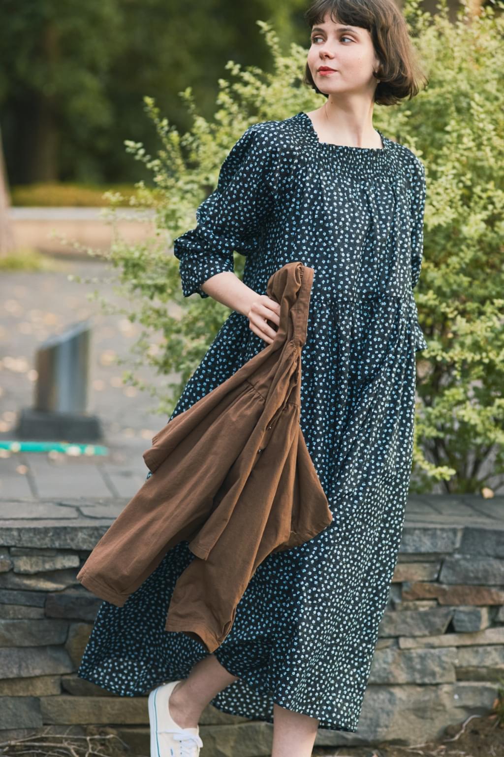 大人の花柄はシックなトーンでまとめるのが◎。黒地に抽象的なブルーの小花柄はシックだけれど存在感がある。首周りはシャーリングのスモックになっていて、顔周りがさりげなく華やかに。ブラウンのジャケットを羽織ってダークトーンでまとめて、足元は白のスニーカーで抜け感を出して。