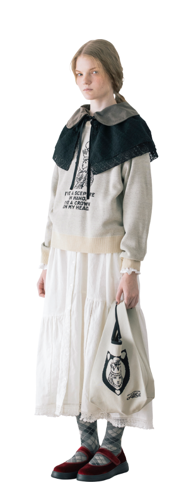チェスの女王になったアリスをジャカード織りで描いたニットは存在感大。シンプルなコーディネートでも世界観が際立ちます。どんなスタイルにもプラスしやすい、お揃いのニットバッグもラインナップ。