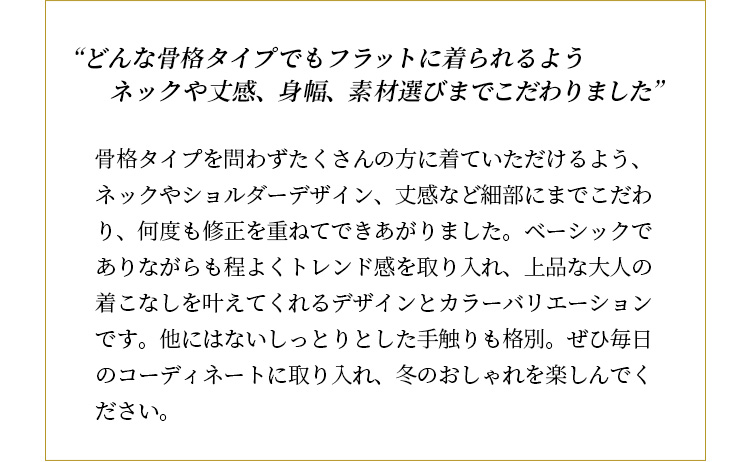ベーシックなハイネックデザインに、今年らしいボリュームスリーブを加えました。ナチュラルやストレートタイプの骨格の方でも肩まわりが強調されすぎないよう、袖のボリュームの切り替えをやや内側に設定したのがこだわりです。裾はリブで絞らずフラットにしているので、ウエストはOUTでもすっきりと着こなせます。